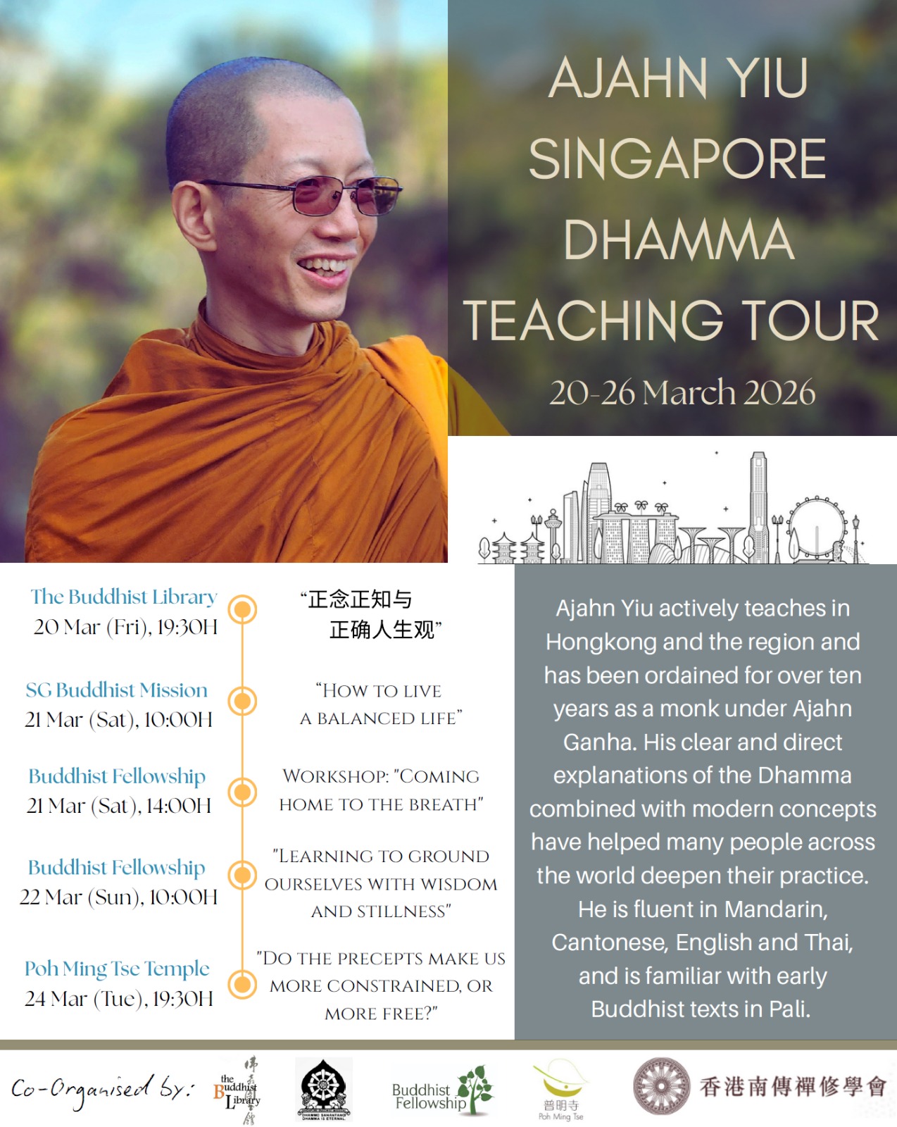 View Larger Image Past Event – 佛法开示 – 阿赞耀 【正念正知与正确人生观】Dhamma Talk in Mandarin by Ajahn Yiu 日期: 20.03.2026 (星期五) 时间: 7.30pm (预计结束时间为9.30pm) 地点: 佛教图书馆2楼 无须报名 可参考以下海报了解更多详情,谢谢。 Buddhist Library2026-03-21T15:32:35+08:00 Share This Story, Choose Your Platform! FacebookXRedditLinkedInTumblrPinterestVkEmail Related Posts Past Event – Dhamma Talk by Ajahn Nandiyo Gallery Past Event – Dhamma Talk by Ajahn Nandiyo Past Event – 佛法开示 – 阿姜开照 【舍随念】Dhamma Talk by Ajahn Kai Zhao Gallery Past Event – 佛法开示 – 阿姜开照 【舍随念】Dhamma Talk by Ajahn Kai Zhao Past Event – Chinese New Year Celebrations 2026 Gallery Past Event – Chinese New Year Celebrations 2026 Past Event – Tuesday Guided Meditation starts 6 Jan 2026 Gallery Past Event – Tuesday Guided Meditation starts 6 Jan 2026 Past Event – Medichant 2025 清净正念迎新年 Gallery Past Event – Medichant 2025 清净正念迎新年