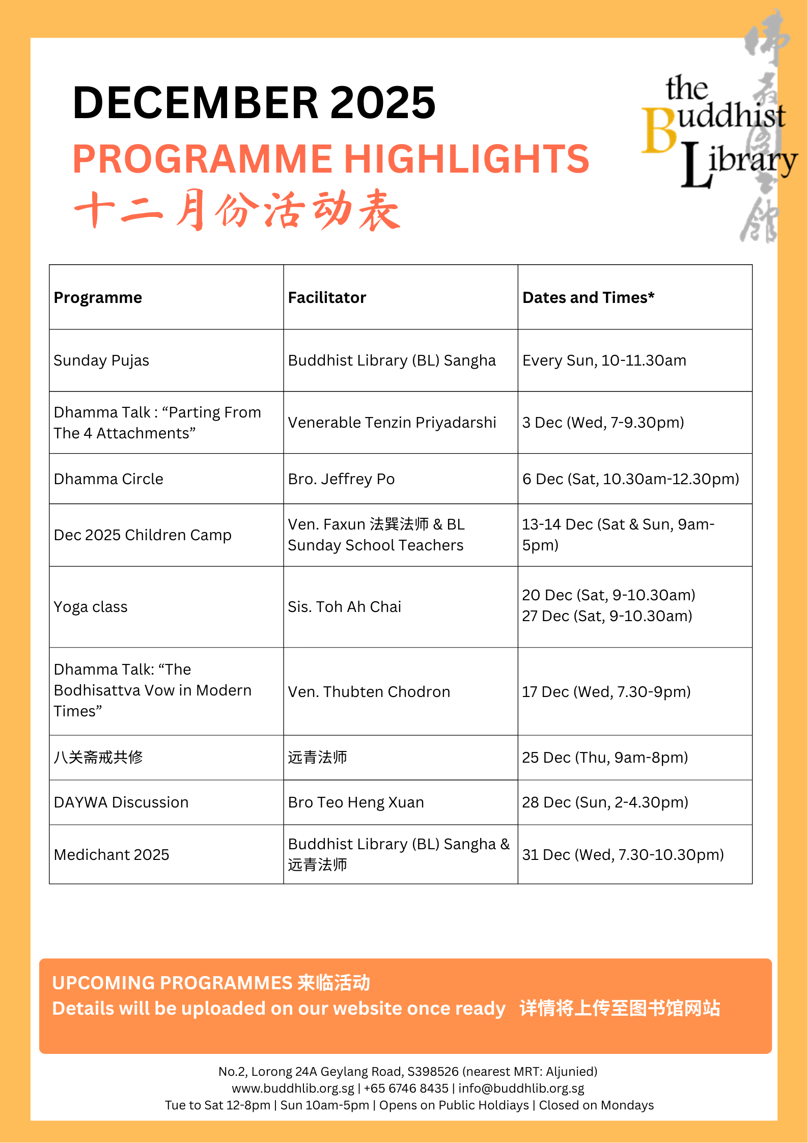 *Due to library renovations, our upcoming Medicine Buddha Puja event will be live-streamed on our Facebook page. We apologize for any inconvenience caused and appreciate your kind understanding.
